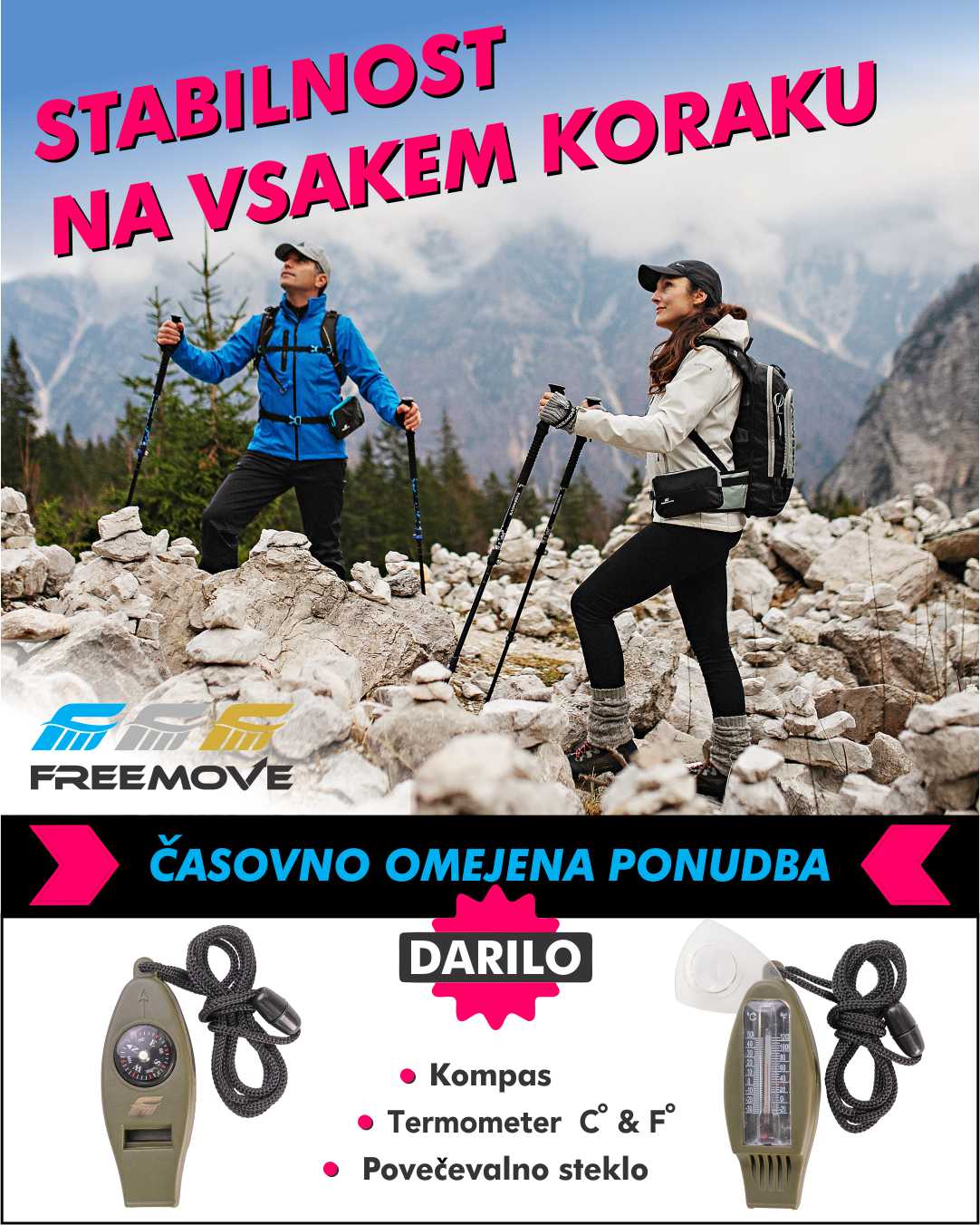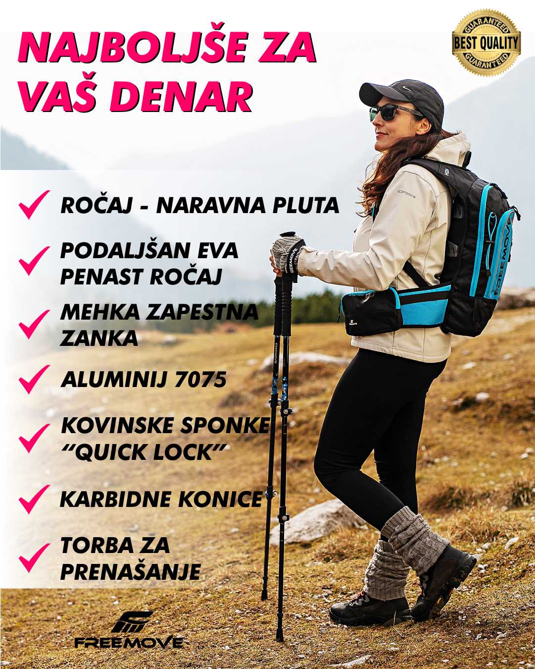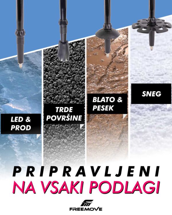 Pohodne palice FREEMOVE so kakovostne trodelne teleskopske aluminijaste palice, ki zagotavljajo udobje in vsestranskost uporabe v vsakem letnem času. Palice nudijo zanesljivo oporo na dnevnih pohodih ali večdnevnih trekingih.