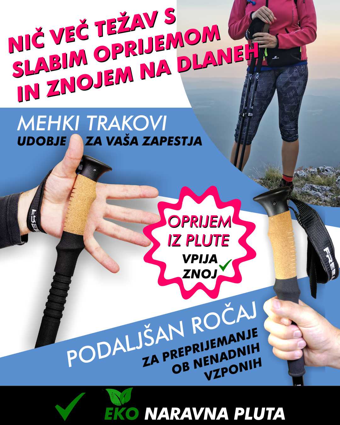 - podaljšan EVA penast ročaj je namenjen preprijemanju palic v strmih pobočjih, brez potrebe po spreminjanju dolžine palic;
