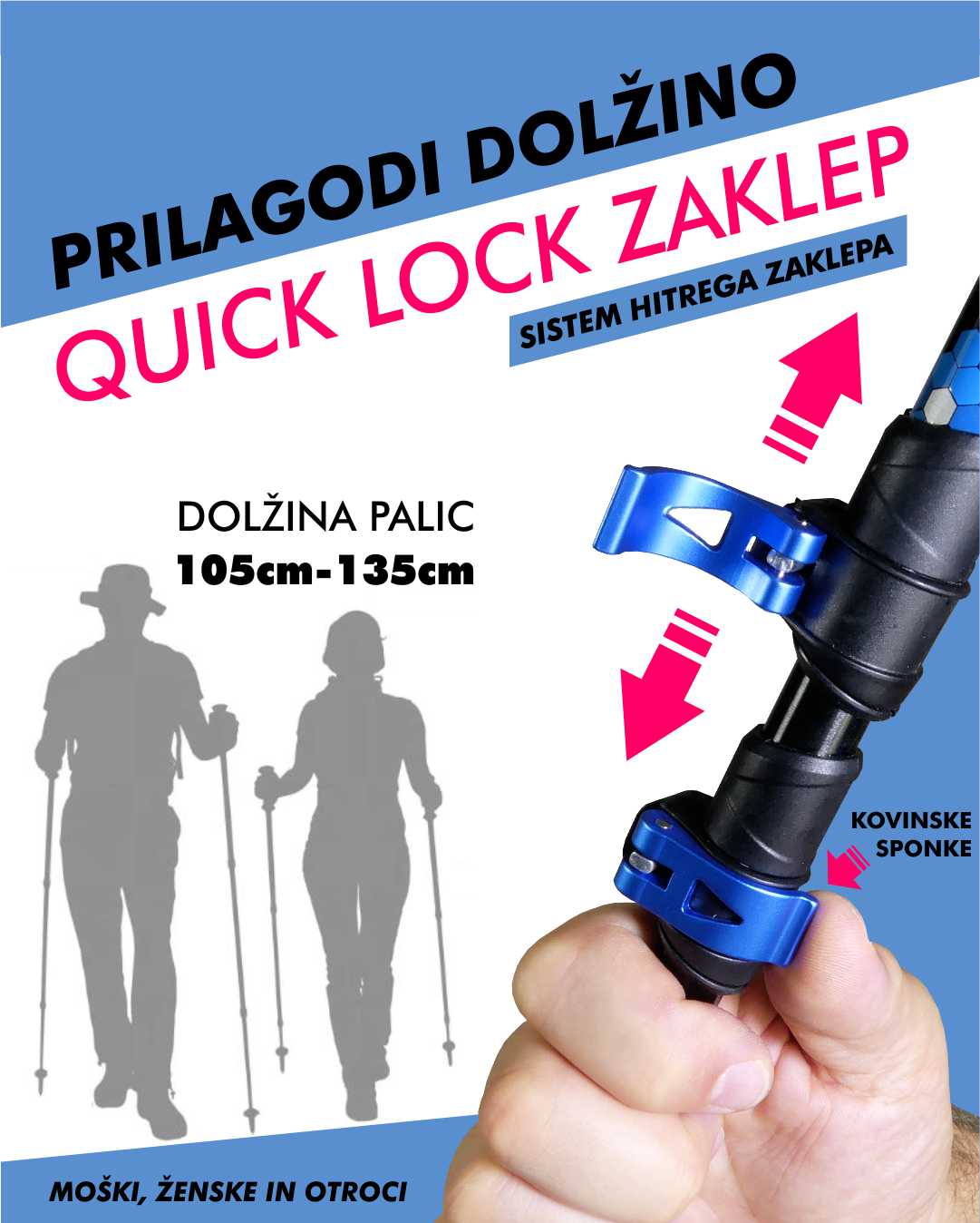 - »Quick lock« mehanizem s kovinskimi sponkami omogoča enostavno in hitro prilagajanje dolžine palic;